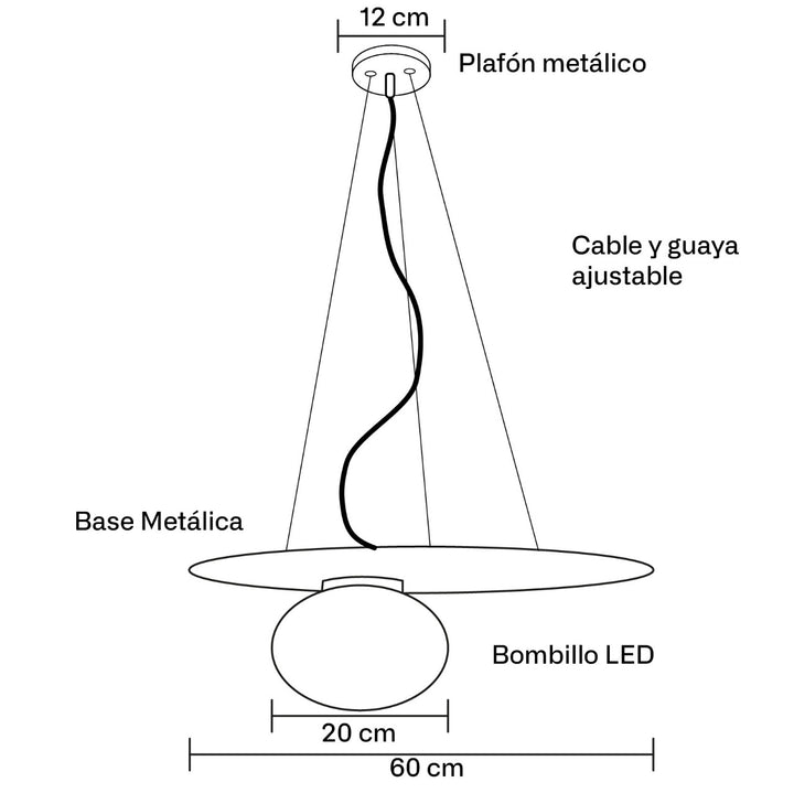 Lámpara de techo colgante, fabricada en metal, vidrio y pintura electrostática. Incluye bombillo LED y cable de 1,30 metros. Ideal para espacios como salas o comedores. Nuestra promesa de entrega es de 15 días hábiles.