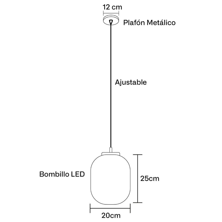 Lámpara de techo colgante, fabricada en metal, vidrio y pintura electrostática. Incluye bombillo LED y cable de 1,30 metros. Ideal para espacios como salas, habitaciones o comedores. Nuestra promesa de entrega es de 15 días hábiles.