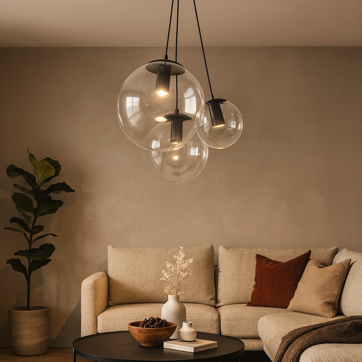 Lámpara de techo colgante, fabricada en metal, vidrio y pintura electrostática. Incluye bombillos LED. Ideal para espacios como salas o comedores. Nuestra promesa de entrega es de 15 días hábiles.
