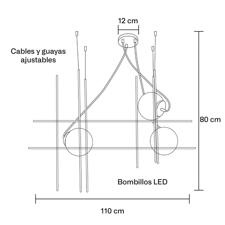 Lámpara de techo colgante, fabricada en metal, vidrio y pintura electrostática. Incluye bombillos LED y cable de 1,30 metros. Ideal para espacios como salas o comedores. Nuestra promesa de entrega es de 15 días hábiles.