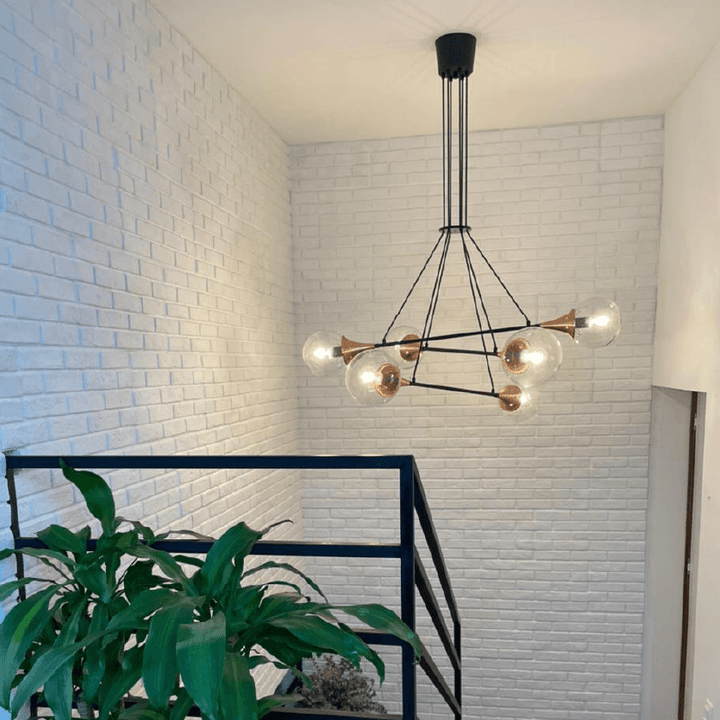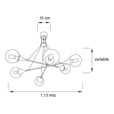 Lámpara de techo colgante, fabricada en metal, vidrio y pintura electrostática. Incluye bombillos LED y cable de 1,30 metros. Ideal para espacios como salas o comedores. Nuestra promesa de entrega es de 15 días hábiles.