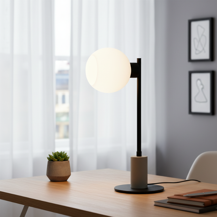 Lámpara de mesa, fabricada en metal, vidrio y pintura electrostática. Incluye bombillo LED. Ideal para espacios como habitaciones o salas. Nuestra promesa de entrega es de 5 días hábiles. Disponible en acabado macadamia.