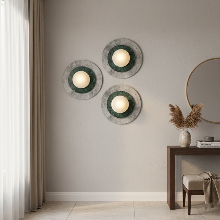 Lámpara de pared, fabricada en piedra natural (mármol). Incluye bombillo LED. Ideal para espacios como salas o habitaciones. Nuestra promesa de entrega es de 15 días hábiles.