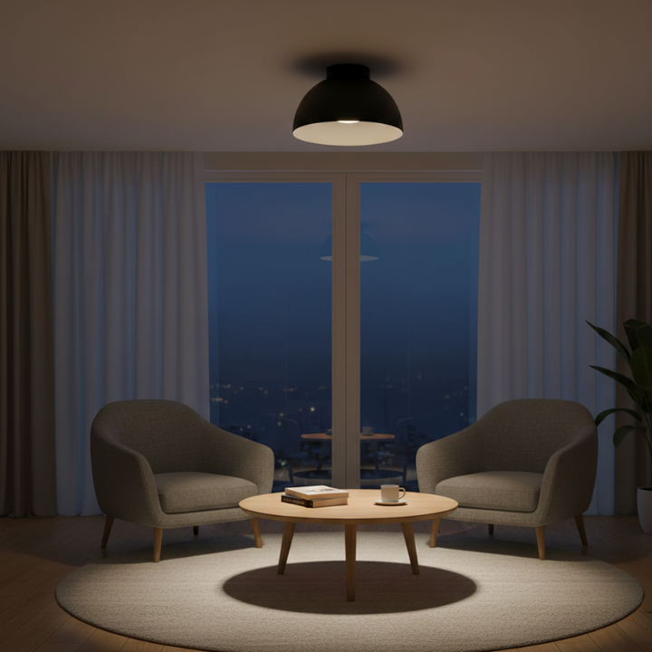 Lámpara de techo de sobreponer fabricada en metal y pintura electrostática. Incluye bombillo LED. Ideal para espacios como habitaciones, cocinas, salas, comedores o estudios. Nuestra promesa de entrega es de 5 días hábiles. Disponible en acabado negro.