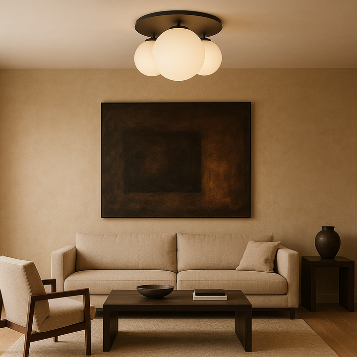 Lámpara de plafón, fabricada en metal, vidrio y pintura electrostática. Incluye bombillos LED. Ideal para espacios como comedores o salas. Nuestra promesa de entrega es de 15 días hábiles.
